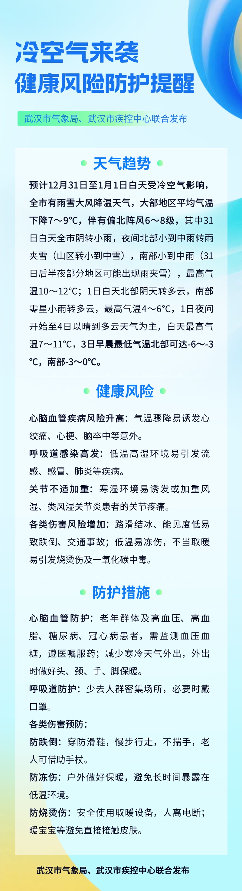 应对寒冷的到来,保障武汉市民的健康安全。武汉市气象局、武汉市疾病预防控制局联合发表文章《寒冷天气来了!健康风险防护提示》,武汉市交通局与武汉市气象局联合发布《交通天气风险报告》。请注意!