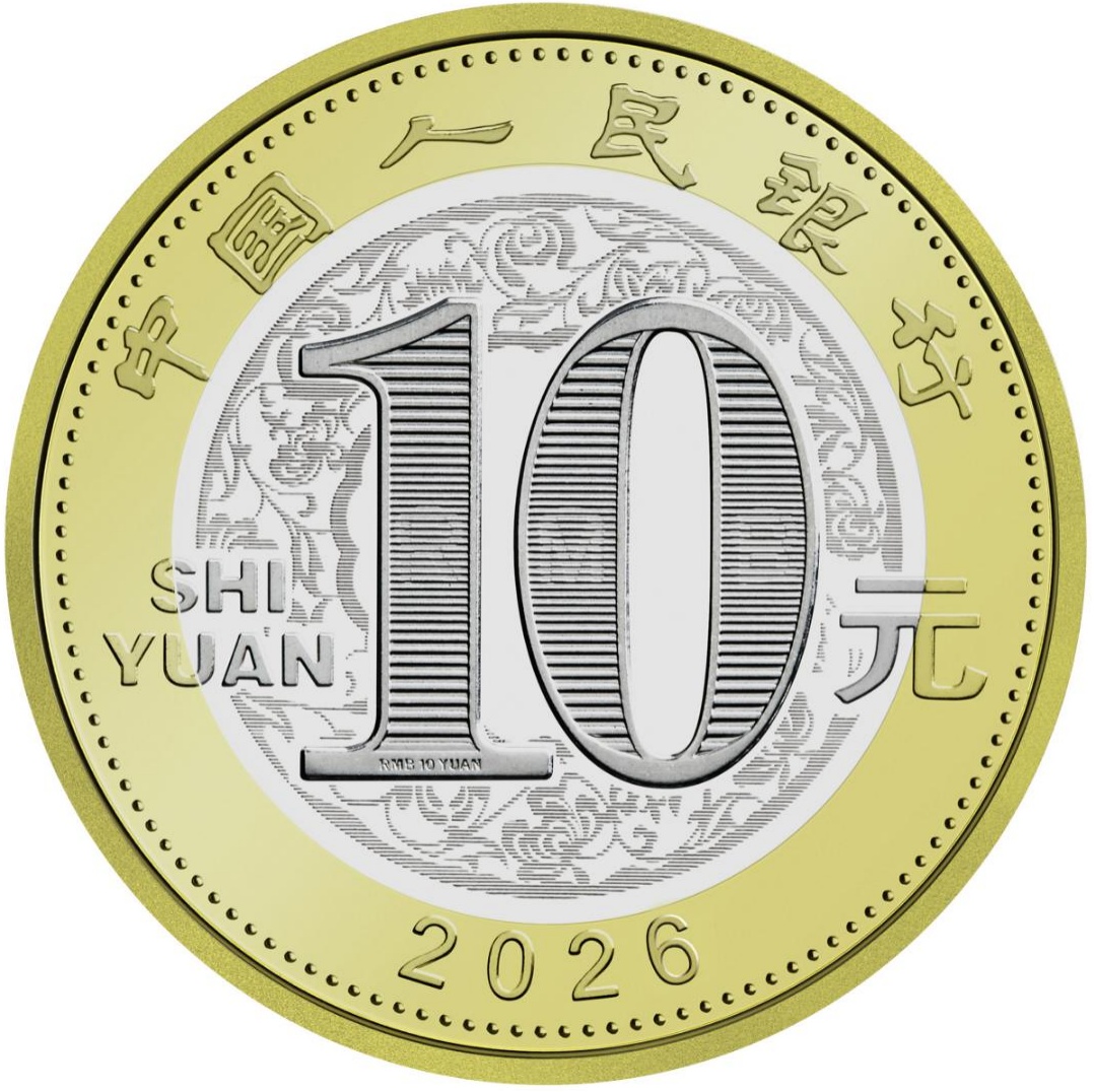 双色铜合金纪念币正面图案为“中国人民银行”、“10元”字样、汉语拼音“SHIYUAN”字样和年号“2026”,背景镶有一束鲜花。