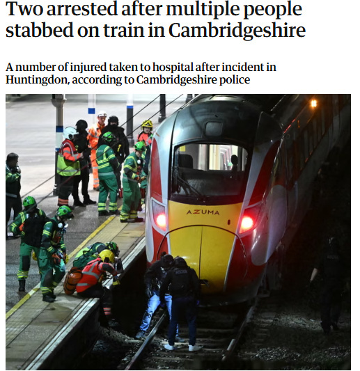 中新社11月2日电 据英国《卫报》报道,当地时间11月1日,剑桥郡开往亨廷顿的火车上发生持刀袭击事件,两人被警方逮捕。图片来源:英国卫报报道截图 报道称,剑桥郡警方在晚上7点39分左右接到警报后赶赴现场。当地时间11月1日,目击者称,火车上有受伤人员,可以看到乘客跑向其他车厢,以避免持刀男子。其他目击者称,他们看到警察用枪指着站台上一名持刀男子,但该男子最终被电击枪制服。至于受害者,一些目击者称他们看到六到八人受伤,而其他人则称可能有多达 12 人受伤。救援机构发言人证实“几名患者已被送往医院”。英国交通警察和剑桥郡警察事件发生后共同作出回应。英国首相斯塔默称这一事件“极其令人担忧”,并敦促人们听从警方的指示。据报道,涉事列车于当地时间18时25分从唐卡斯特出发,前往伦敦国王十字车站。亨廷登距伦敦约 50 公里。该事件导致多趟列车取消,对相关线路造成“重大干扰”,铁路公司建议乘客更改出行时间。